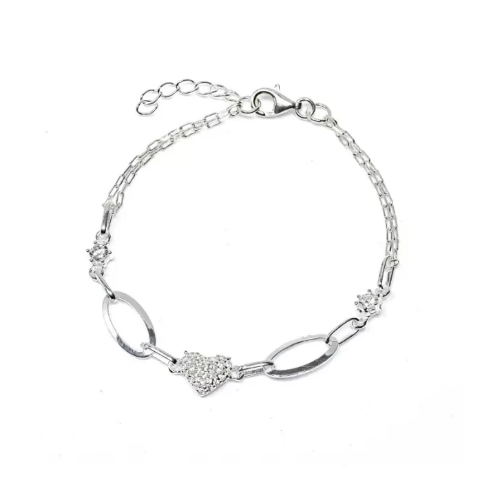 Изящна дамска гривна от сребро 925, съчетаваща фина верижка с овални звена и нежно сърце, обсипано с блестящи камъни. Декоративните елементи придават допълнителна елегантност, превръщайки я в перфектен аксесоар за всяка модерна жена. Символ на любов и стил, тази гривна е идеален избор както за подарък, така и за лично удоволствие.