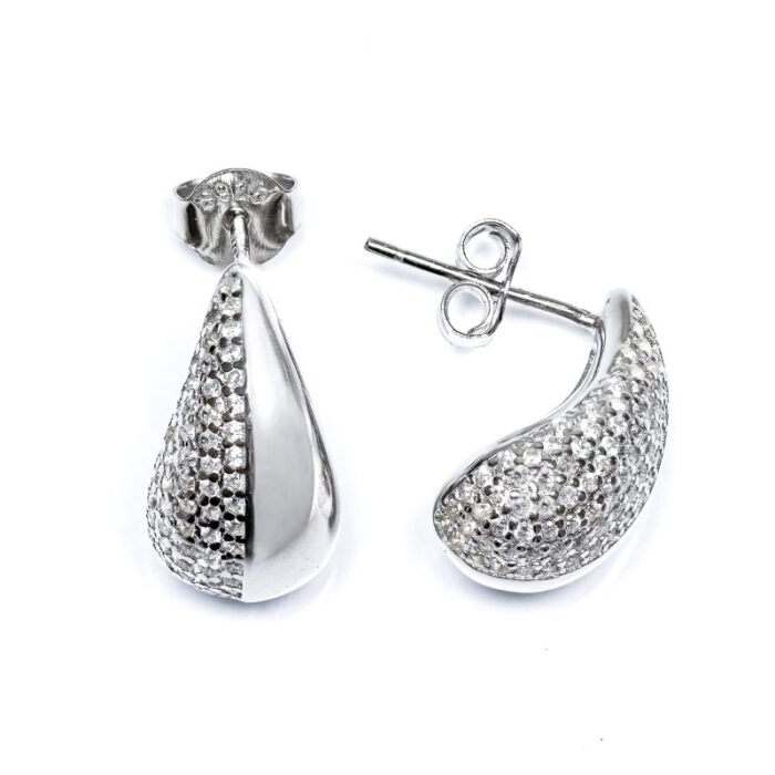 Елегантни дамски обеци, изработени от висококачествено сребро 925, с изящна форма на капка. Половината повърхност е инкрустирана с фини блестящи камъни, придаващи луксозен блясък. Идеален избор за стилно допълнение към вечерен или официален тоалет.