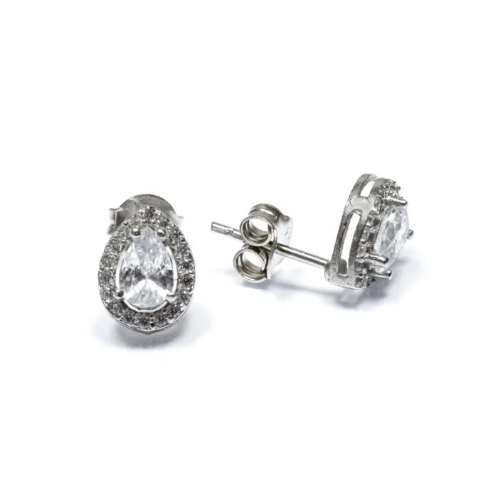 Изящни обеци от сребро 925 с централeн камък във формата на капка, обграден от фино изработен ореол от малки блестящи камъчета. Придават елегантност и сияние, подходящи за официални поводи и специални моменти.