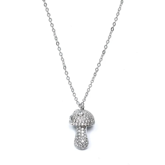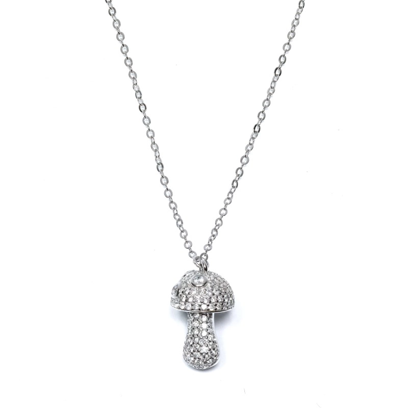 Забавно и модерно колие от сребро 925 с уникална висулка във форма на гъбка. Цялата повърхност е обсипана с блестящи циркони, които придават игрив и едновременно елегантен блясък. Стилен аксесоар за дами с настроение, които обичат нестандартните бижута и искат да се открояват.