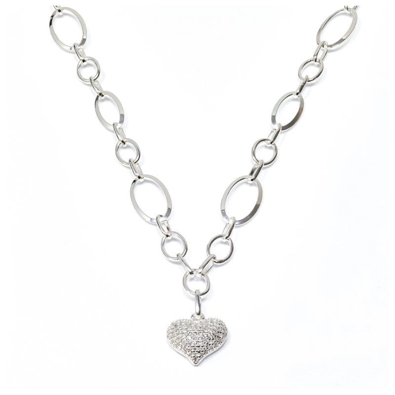 Елегантно колие от сребро 925 с модерна масивна верижка от елипсовидни звена и впечатляваща висулка във форма на сърце. Цялата повърхност на сърцето е обсипана с фини циркони, които придават неустоим блясък и луксозен вид. Идеален избор за дами, които търсят едновременно стил, романтика и изразителен дизайн.