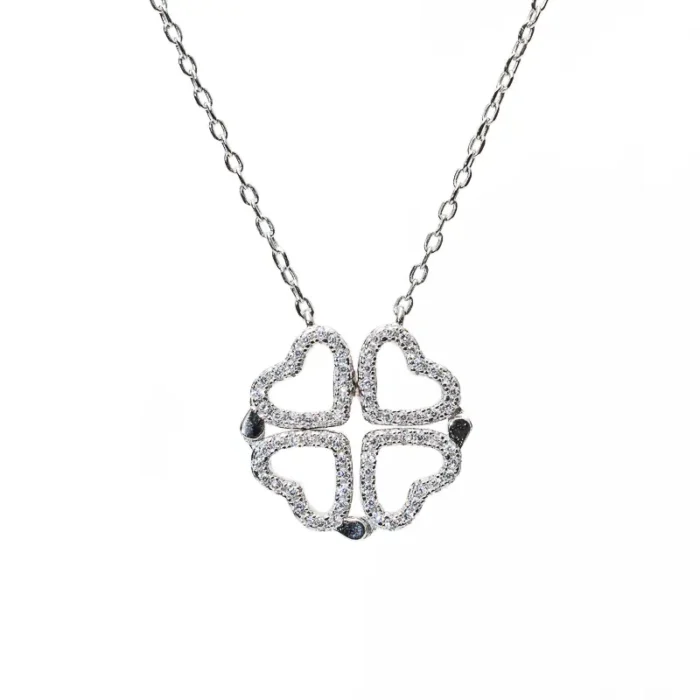 Изискано дамско колие от сребро 925 с уникален дизайн на четирилистна детелина, оформена от блестящи сърца. Символ на любов, късмет и надежда, това бижу крие малка тайна – отварящата се висулка, която може да съхрани специално послание. Перфектен избор за подарък, изпълнен със смисъл и емоция.