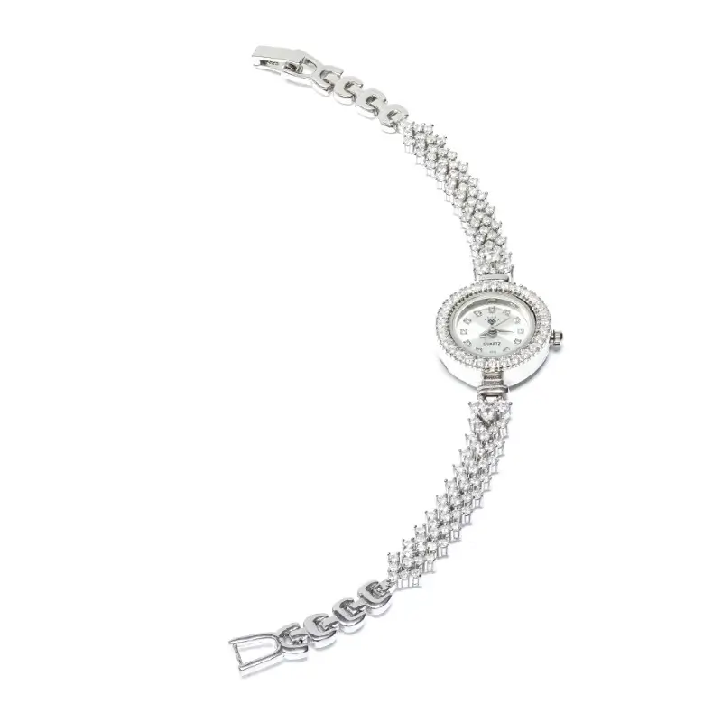 Кръгъл дамски сребърен часовник с фини циркони – Стилен модел от сребро проба 925 с кръгъл циферблат, обграден от ред фини бляскави циркони. Елегантната гривна с двойни редове камъни придава изисканост и неповторим чар, подходящ за специални поводи и ежедневна елегантност.