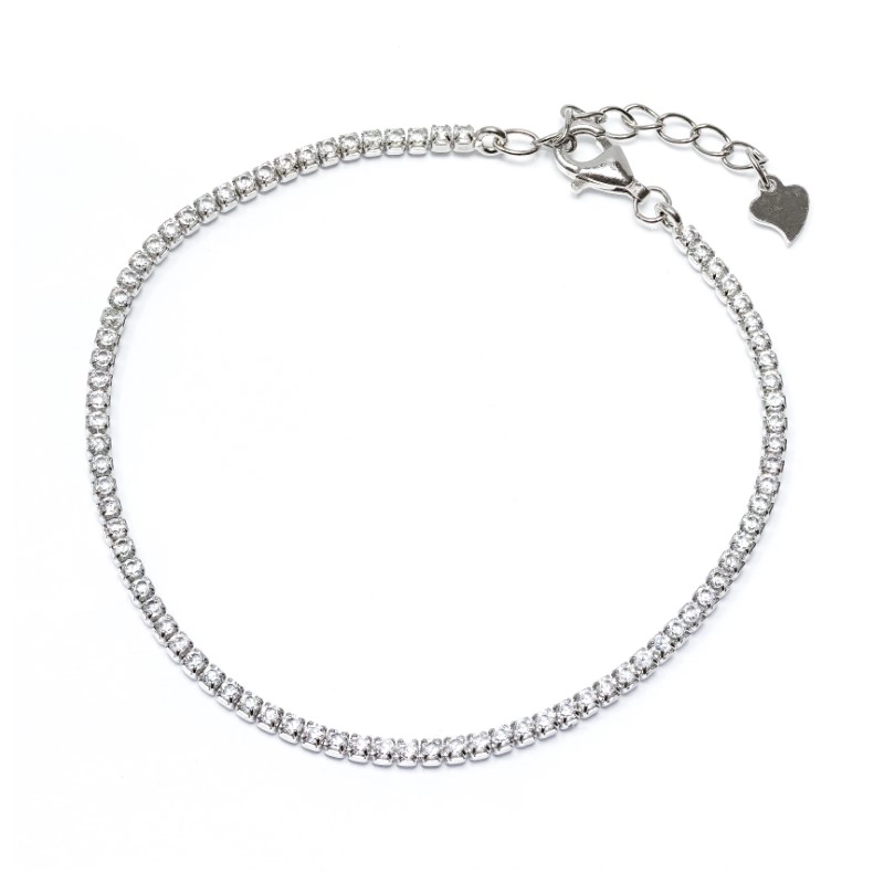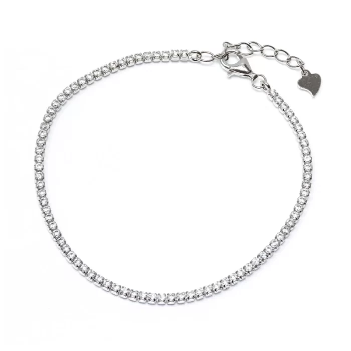 Тази елегантна дамска тенис гривна е изработена от висококачествено сребро 925 и е инкрустирана с ред от фино шлифовани камъни цирконий, които улавят светлината и излъчват ослепителен блясък. Дизайнът ѝ е класически и универсален – подходящ както за ежедневието, така и за официални поводи. Регулируемата дължина и удобната закопчалка осигуряват перфектно прилягане към всяка китка.